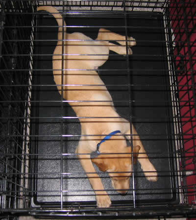Derby sitting in his crate. Does he look a little thin to you? He’s definitely long.
