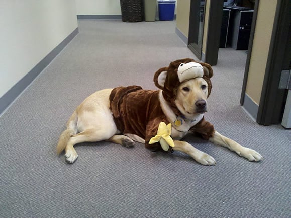We’re not as clever as many of the people out there on the interweb, but we do like to be somewhat original. The last few years we ordered children’s Halloween costumes from Amazon (aff link) and turned them into our very own Do-It-Yourself Dog Costumes. Check out Dublin in his monkey outfit: