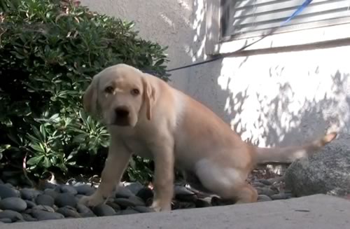 Encourage the puppy to go by using words such as “Get Busy”. This is the command used at Guide Dogs of America. We use the same command with all of our puppies in training.