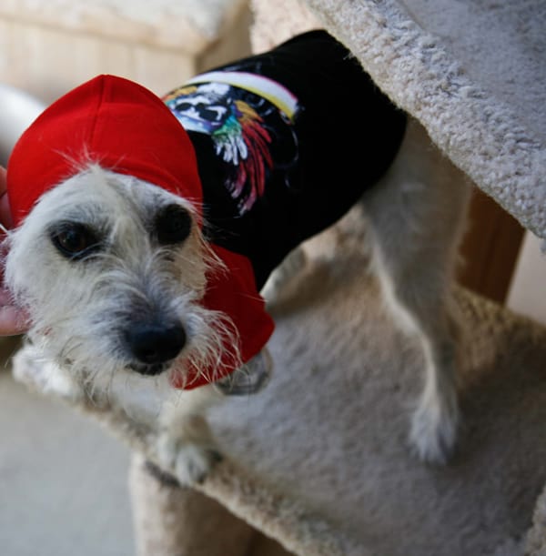 Ralphie is about 15 pound Cairn Terrier and he got to try on the Medium sized Bret Michaels Pets Rock Tatoo Hoodie.